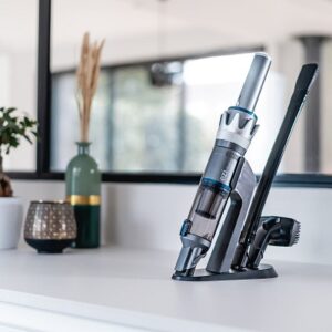 - Accessoires : Suceur long 43 cm, brosse 2 en 1, brosse plate, tube aluminium, base de chargement
